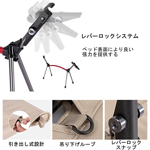 人によってはインフレータブルマットなどを追加しなくても寝られるぐらい快適と言われています。またレバー式のロックを採用していることから力がない方でも使いやすくソロキャンプに最適なコットです。