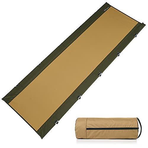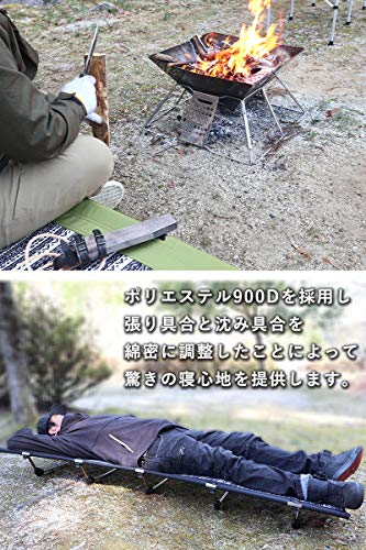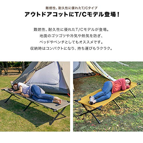 TC素材は焚き火との相性がよく、秋~冬などの焚き火を楽しみやすい季節のソロキャンプで使いやすい魅力があります。また、ナチュラルな風合いなどポリエステルなどにはない質感が好きな方から評価が高いですよ。TC素材ですが比較的低価格でワイドサイズなどのバリエーションがあり寝心地もいいコットになっています。