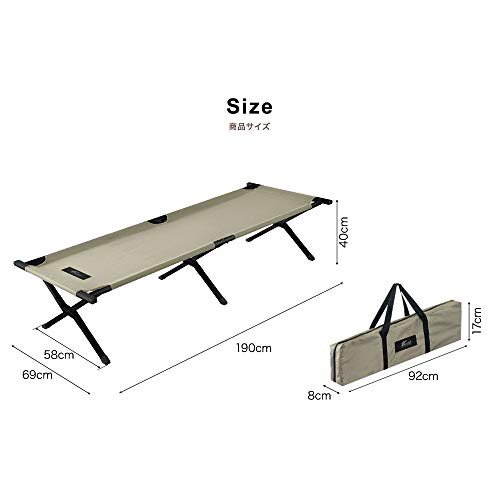 フレームはスチールではなくアルミ合金ですが、ベッドシートの素材が混紡のため重たく重量は5.1kgになります。大きさは 190×69×高さ40cm、 折りたたみ時92×17×8cmと大きいことからオートキャンプでのソロキャンプでしか使えません。