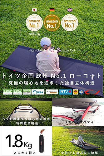 重心が低いため安定しやすく子どもでも利用しやすいローコットです。脚部が多く安定しているなどの評価が多いですよ。誰もが知っている人気ブランドではありませんが、評価の数も多めでコンパクト、かつ軽量でソロキャンプで使いやすいコットになっています。