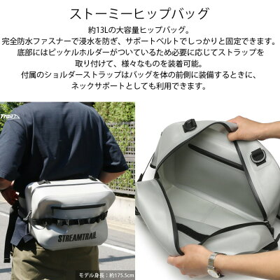 水辺のアウトドアシーンで活躍してくれる機能的なギアを揃える人気ブランド・ストリームトレイルのストーミーヒップバッグは、容量が13Lと大きめサイズの完全防水仕様のアウトドア用ボディバッグになります。