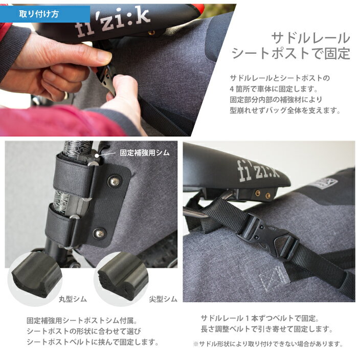 選び方では10Lとは別に、6L・15L容量からも決められるので、用途に合わせて購入することが可能です。フック&ループストラップで簡単にサイドレール&シートポストに取り付けられます。