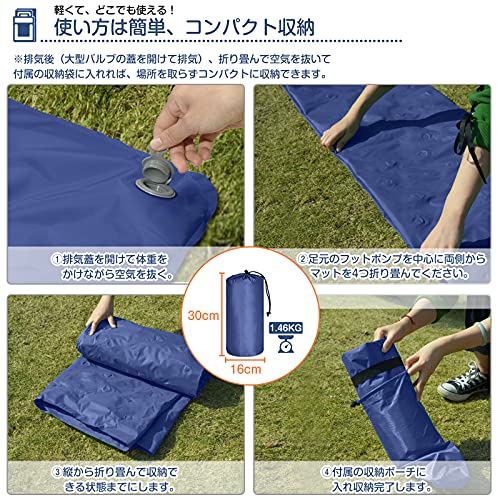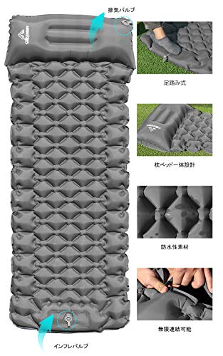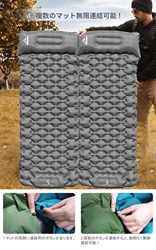 サイズは200cm×120cmで、大人が2人寝転がっても余裕があります。連結して拡張することも可能なため、複数人のキャンプにぴったり。空気を抜けばコンパクトにまとめられ、持ち運びの際に手間がかからないのも魅力です。