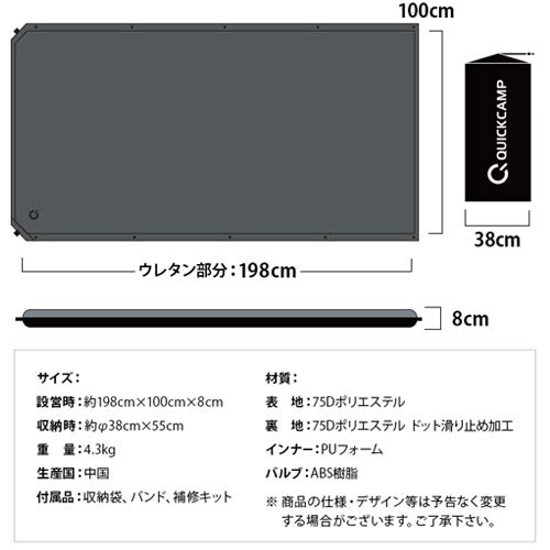 約203×137×8cm、ウレタン部分は200×130×8cmの大きいクイックキャンプのマットです。大きい分収納サイズは約φ38×70cmになり重量は5.7kgになります。本品はシングルサイズの通常のマットと同じように色違いありグレーとカーキの2色から選べますよ。