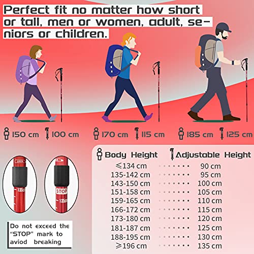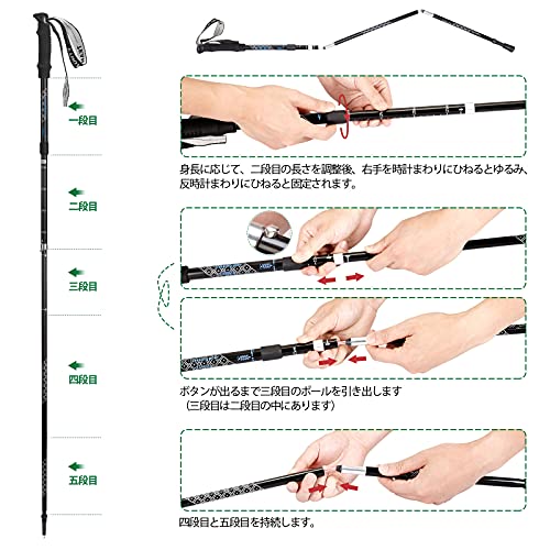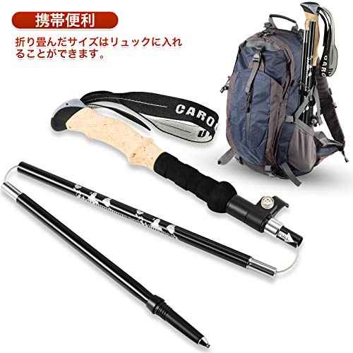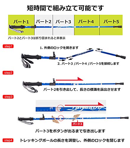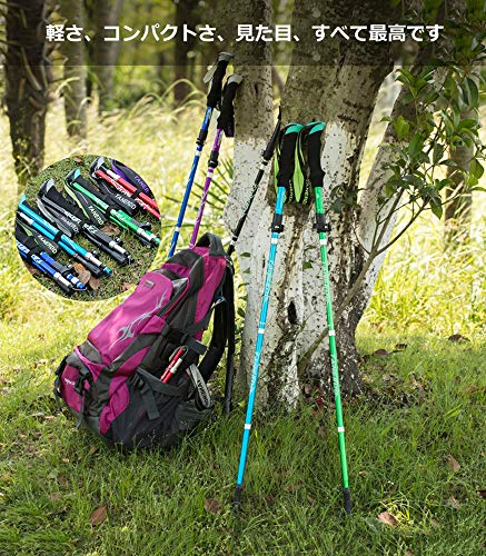五段階に伸縮できる、機能的な商品です。身長に合わせて簡単に長さを変えられるモデルを探している場合におすすめ。折りたたむと34cmの長さになるため、気軽にトレッキング用のバックパックに装備できます。