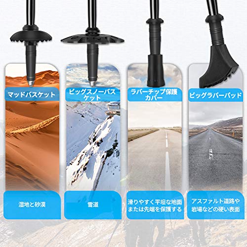 必要な時に着脱できる3種類のバスケットが付属しているのも、おすすめしたいポイントです。砂利や岩場、雪、といったように路面の状態に合わせて付け替えられます。さまざまなトレッキングシーンに対応できる商品を求めている場合にいかがでしょうか。
