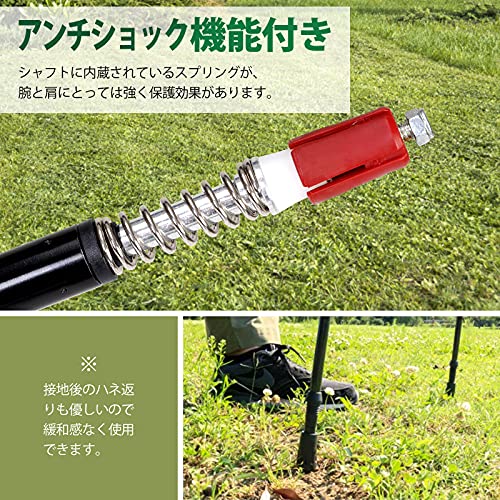 先端の部分には、バネ式の衝撃吸収システムを内蔵しています。硬い路面でも衝撃を吸収し、体への負担を抑えられるのが特徴です。また、タングステンマンガン鋼製を先端の素材に採用することで、壊れにくく安全に使えるポールに仕上げています。