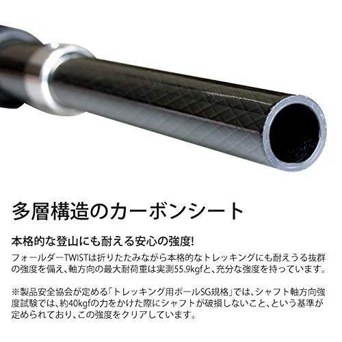 トレッキングポールとしての強度も高く、耐荷重55.9kgを実現。組み立てる際はボタンがカチッとなるまで引き出すだけで、折りたたむ際はシャフトをひねるだけと、非常に簡単です。