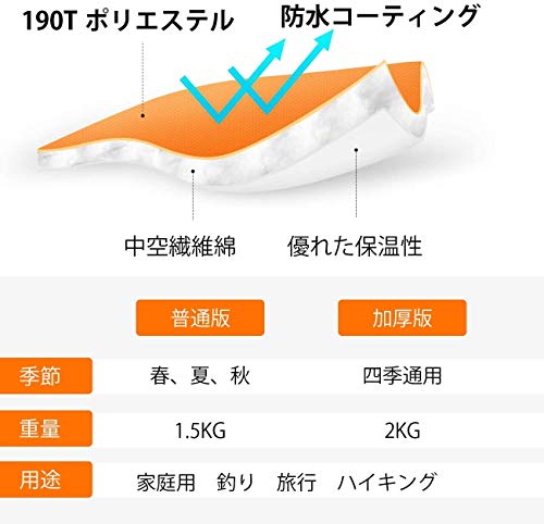 中に入ると、まるで布団のようにふんわりとした質感を楽しめると評判を集めています。底つき感が少なく、長時間寝ても体が痛くなりにくいのも特徴です。ダブルファスナーやファスナーガードなど、ファスナーをしっかり閉めるための工夫が凝らされています。