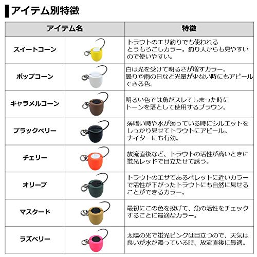 重量は最大2.2g。カラー展開は定番のパステルカラーからギラギラ系まで揃っており、魚のコンディションに合わせた使い方がおすすめです。
