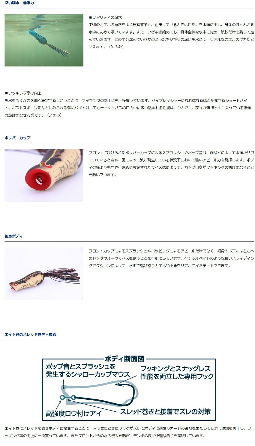 通常こういったトップウォータープラグの使用には水に浮くナイロンラインやPEラインの使用が推奨されていますが、このルアーはバス釣りのメインストリームであるフロロカーボンラインの使用を前提に設計されており、タックルの交換なくハイパフォーマンスを実現できるダイワルアーといえます。