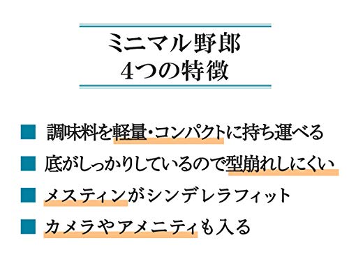 本体の重量は100gと、持ち運びの際の負担がかかりにくい軽量タイプです。調味料を入れても重たくならず、コンパクトな収納バッグが欲しい場合におすすめ。スパイスやハーブなどの必須品の他に、メスティンなどの調理用具も収納できるのが魅力です。