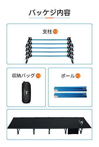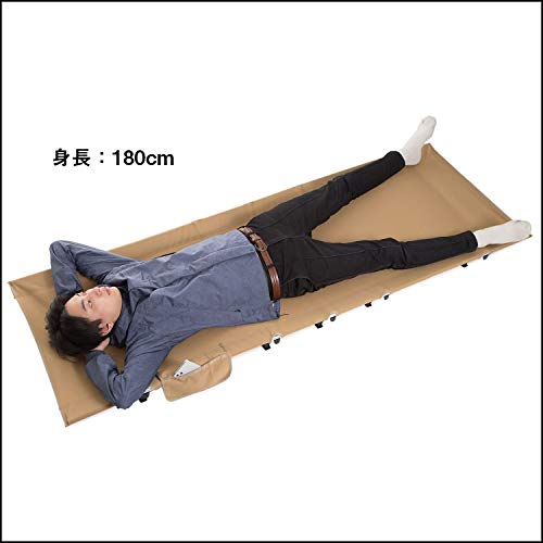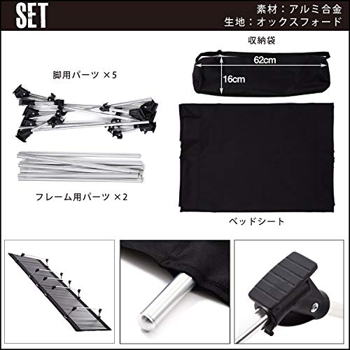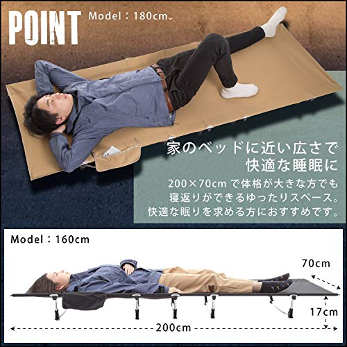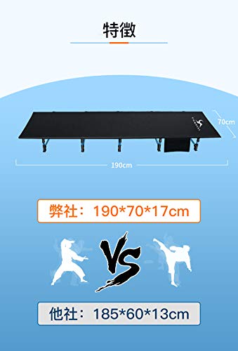 こちらは生地が厚手のナイロンで防水防塵防振の機能があります。フレームはアルミニウムなので軽量で、収納時の収納袋付きです。他のローコットと比べても、幅、高さ、縦と大きいサイズですのでゆったりと寝ていただけます。