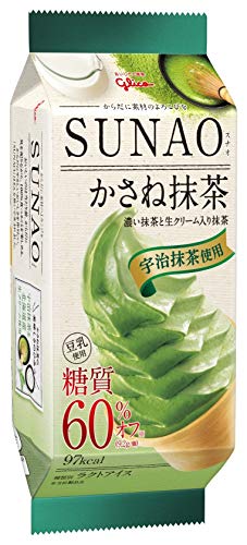同じ抹茶味のグリコのアイスと比較しても、sunaoは1個97kcalで脂質5.4gで、低カロリー低脂肪です。抹茶は苦みがある分、糖質が多いように見えますが、チョコ&バニラと同じになります。sunaoのコーンアイスは、味が違っても脂質や糖質は同じようです。
