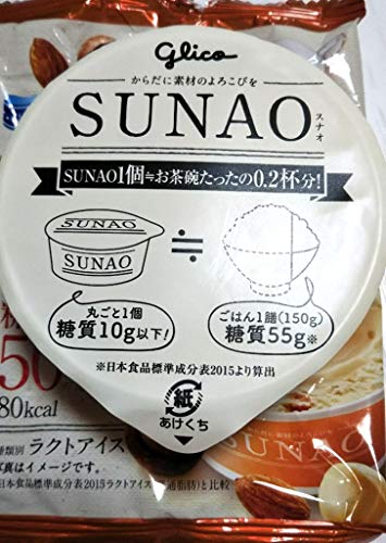 sunaoのバニラ味は1個120g、80kcalで、脂質3.8g、糖質8.3gのソフトクリームです。同じグリコの人気のバニラアイス、牧場しぼりと比較すると、牧場しぼりの脂質が10.8gのため半分以下になります。