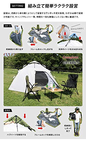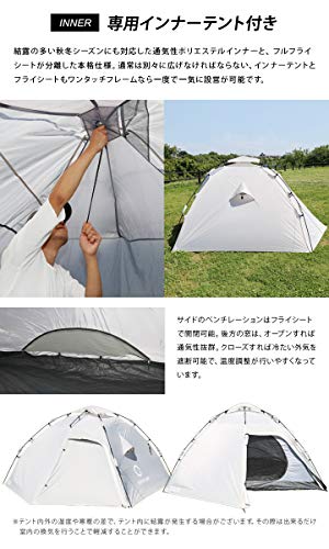 インナーテントがついているダブルウォールテントで、二重構造のために通気性もよく、結露にも強い特徴を持っている製品です。設置方法は、内側から傘を開くようにして設営するワンタッチ式フレームを採用している大型ドームテントで、わずか1分程度で設置を完了させられます。