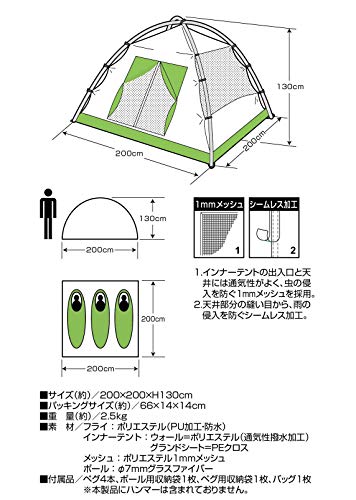定番のブランドというほどまだ知名度は高くありませんが、低価格な点や高い耐水圧になっているところが初心者にもおすすめできるテントです。インナーはフルメッシュのため通気性が高く、初心者がキャンプしやすい春~初秋におすすめのテントになっています。