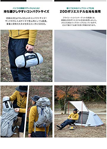 フライシートの材質が登山用のテントでも使われている20デニールのリップストップポリエステルで薄いですが、耐久性ある生地が使われて丈夫です。
