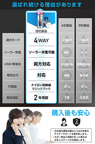 1台で4つの機能をこなす、便利な商品です。ランタンとして使用する場合は、強・中・弱の3種類の点灯モードを選べます。手元灯モードに切り替えると遠くまでしっかりと照らし出し、周囲の状況を把握しやすくなるのが特徴です。テーブルを離れて移動したい時に役立ちます。