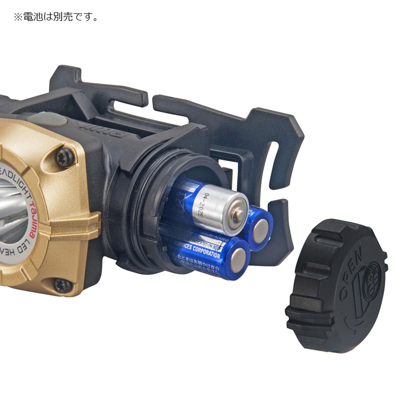 給電は、単4形アルカリ乾電池を3本使用し、電池容量が減った時には点滅で知らせる電池残量警告付きで、電池の液漏れを防ぐロックアウト機構も搭載されているので、長期保管も安心です。