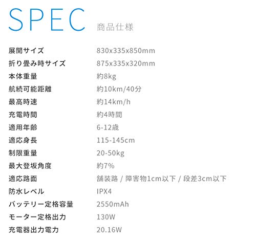 | 仕様 | 適用身長:110cm~175cm、ホイールサイズ:5.5インチのソリッドゴムタイヤ、最大速度:20km/h |