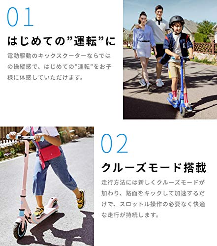 子供が安全に走行できるように、機能やサイズを最適化した電動キックボードです。電動駆動ならでは操縦感で、初めての運転を子供に体験させてあげられます。選び方ではブルーとピンクの2種類の車体カラーより選ぶことが可能です。