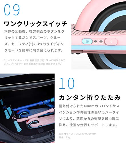 本体起動後に後方側面のボタンをクリックすれば、スポーツ・クルーズ・セーフティの三つのライディングモードに簡単に切り替えることが可能です。本体を支えるステムは数秒で折りたたみできます。約4時間の充電時間で満充電となるおすすめ商品です。