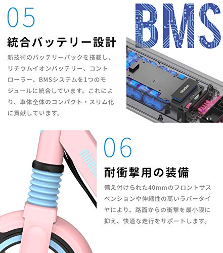 歩道や車道を含む公道においては使用を控え、私有地のみで使うようにと推奨されている電動キックボードです。安全面のことも考慮して、乗車中にはプロテクターやヘルメットを装備することも推奨しています。選び方ではグリーンとピンクの2色より決められる電動キックボードです。