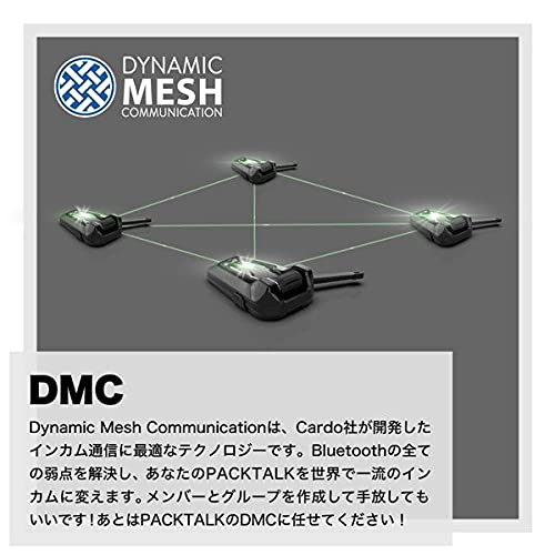 カルドのインカムPACKTALKSLIMはDMC(DYNAMIC Mesh Communication)を採用したメッシュ通信により、最大接続人数15人、最大通信距離6kmでの会話を可能に。