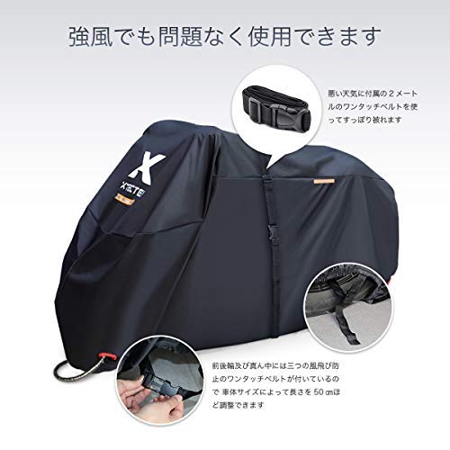 着脱の簡単さは風飛び防止ベルトの位置で決まります。1本のものは固定箇所が少ないので便利です。前後ホイールで固定するバイクカバーは、駐車場所に前後の余裕が必要なものの、バックルを楽に固定できます。