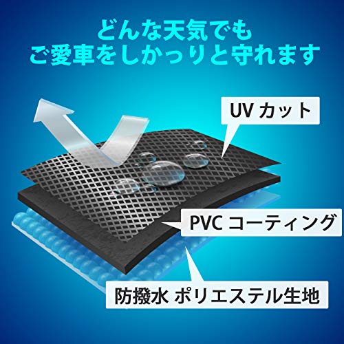 Homwarmのバイクカバーは内側に防水と紫外線対策のポリウレタンコーティングが施されているのがおすすめポイント。生地は厚手の300Dです。バイクカバーの内側に雨水が浸水しにくいと評価されています。