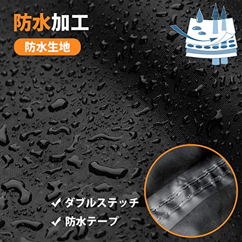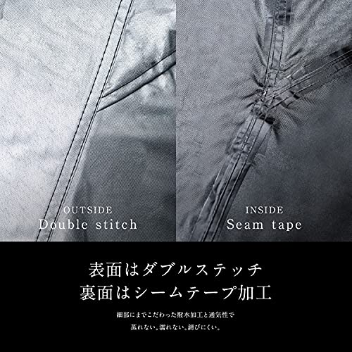 縫い目はシームテープ処理が施されていますが、生地は防水ではなく超撥水です。しかし、最強レベルの強風対策がおすすめ!前後ホイールの風飛び防止バックルはめくれ上がるのを防ぎ、真ん中を絞る長いベルトはバタつきを抑えてくれます。