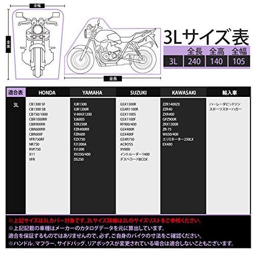 ActiveWinnerのバイクカバーは海外メーカーには珍しく、サイズ別に適合車種を挙げています。あなたのバイクが載っていなくても、記載されているバイクの全長・全幅・全高を照らし合わせればサイズ選びで便利ですね。
