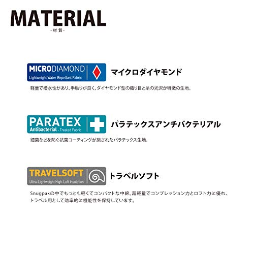 | 素材 | アウター生地:ポリエステル「Micro Diamond」、インナー生地:ポリエステル「Paratex Antibacterial」、中綿:ポリエステル「Travelsoft」 |