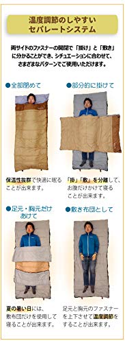 敷布団と掛け布団のように上下で分かれるセパレートタイプの4シーズン向きの寝袋です。本品は寝袋のためアウトドア用ですが、家の中でも使えるようになっていて状況に応じて掛け布団のように半分だけ着たり、使わなかったりと自由に使えるようになっています。