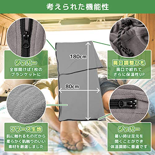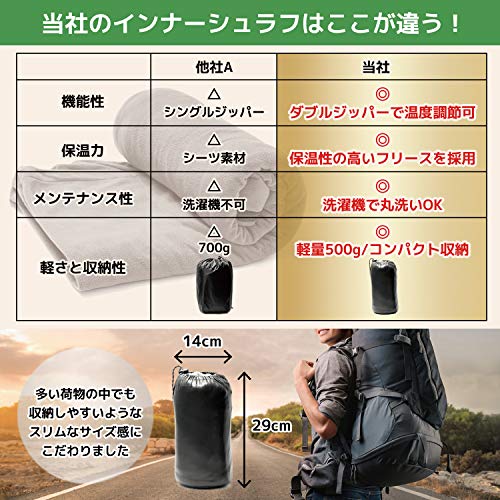 封筒型の寝袋の中に入れるインナーのため薄手ですが、保温性のあるフリース素材のため初夏から初秋程度の暖かい時期ではそのまま使える寝袋です。保温性が低い寝袋もカバーできるため夏用の寝袋しかないミニマリストにもおすすめになります。