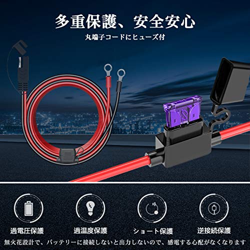 サルフェーション除去機能や充電完了で停止する機能も備えています。原付バイクから大陸系ツアラーまで対応可能です(バッテリー容量:2.3Ah~28Ah)。