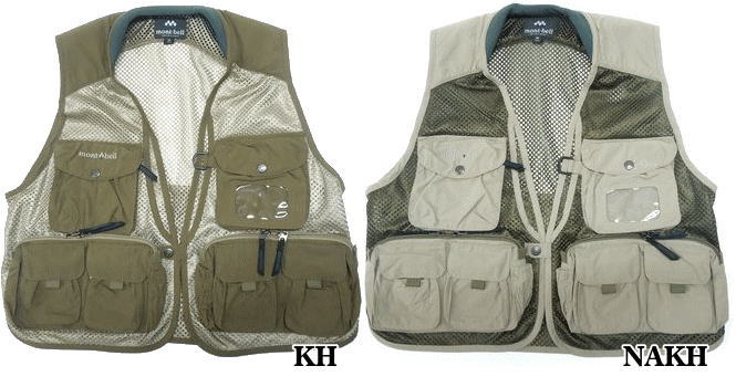 mont-bellのメッシュベストはSからXOまでと背の高い人・低い人・ふくよかな方でもフィットするように作られています。右の胸ポケットのフラップ部分にはmont-bellとネームプレートが。