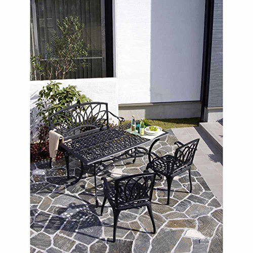 装飾模様が存在感を放っているおしゃれなガーデンテーブルです。重厚感も感じられるブラックの色合いのガーデンテーブルなので、緑豊かなお庭のインテリアにもなってくれます。鋳型に金属を流し込んで凝固させる伝統的手法のアルミ鋳物素材を採用しているためにサビにも強く、雨ざらしになっていても劣化しにくいです。