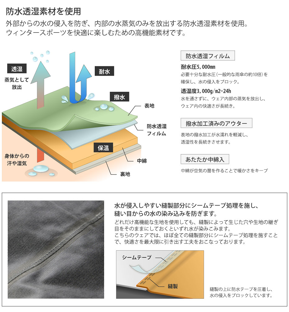 | 素材 | 耐水圧5000mm、透湿3000gの生地 |