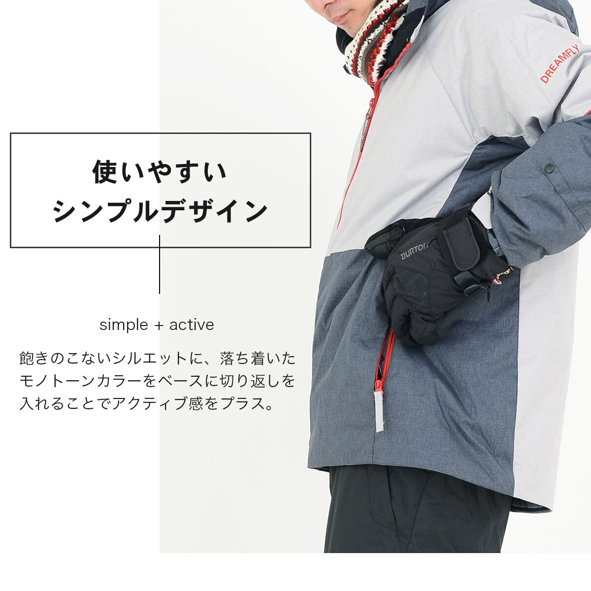 防水透湿性にも非常に優れたメンズ用スノボウェアなので、雪や雨から身体を冷やさないように守りながら、同時に蒸れの少ない着心地をキープすることができます。