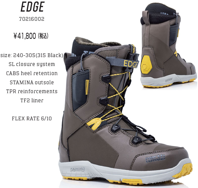 「NORTHWAVE EDGE」は、ホールド感重視の選び方をする人におすすめなスノボードブーツです。タンがアウターとフィットするような構造になっているので、足を適度に固定してくれます。そのためホールド感や安定感重視の選び方をする人は、是非チェックしてみてください。