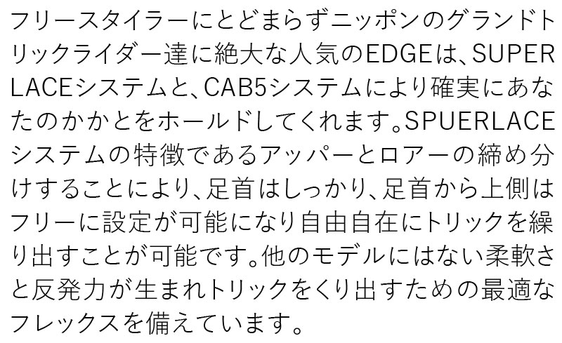 「NORTHWAVE EDGE」は、ヒール部分のフィット具合が高めです。そのためトリックを繰り出しやすく、ある程度レベルの高い人にも向いています。また、自分の足の動きや感覚をボードに伝えやすい構造になっており、より高いパフォーマンスが発揮できるでしょう。