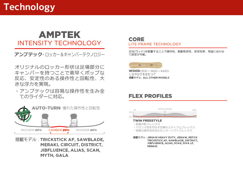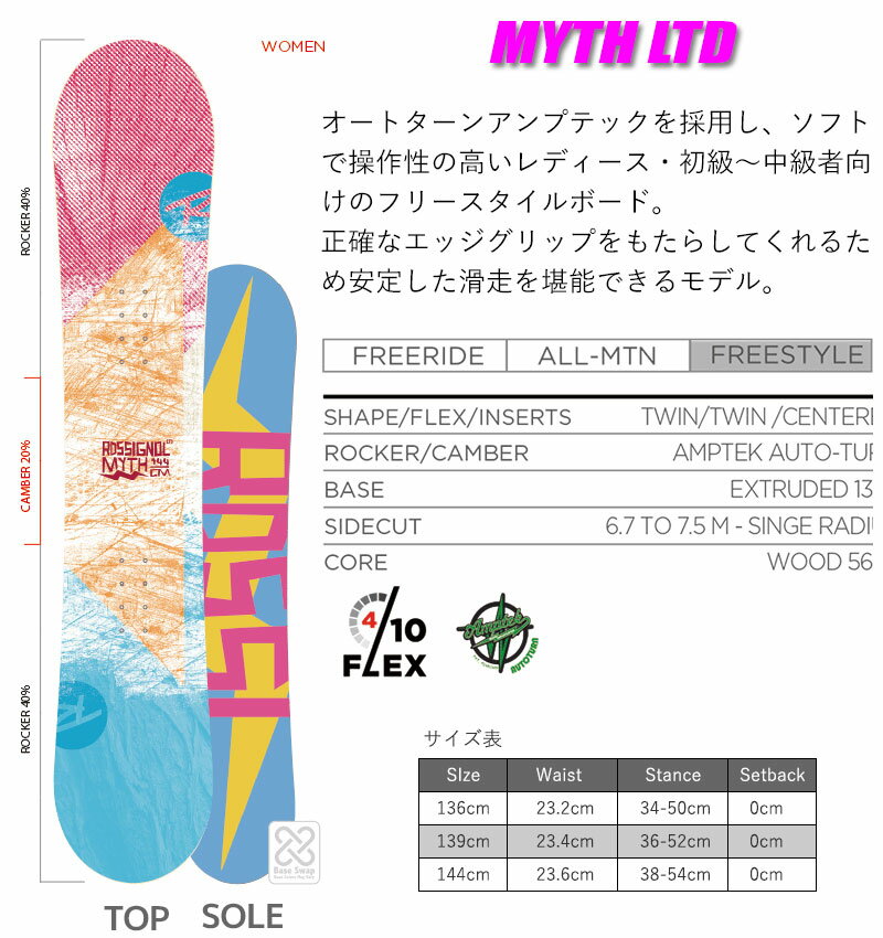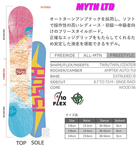 オートターンアンプテックを採用しているために操作性も高く、スノーボード初心者から中級者に向けたフリースタイルボード「MYTH-LTD」がセットの中に含まれています。正確な位置グリップをもたらしてくれるため、スノーボード初心者でも安定した滑走を堪能できるボードです。