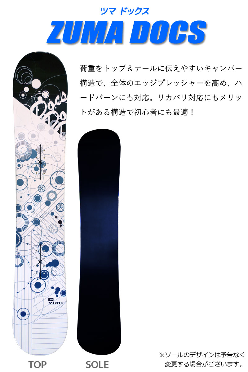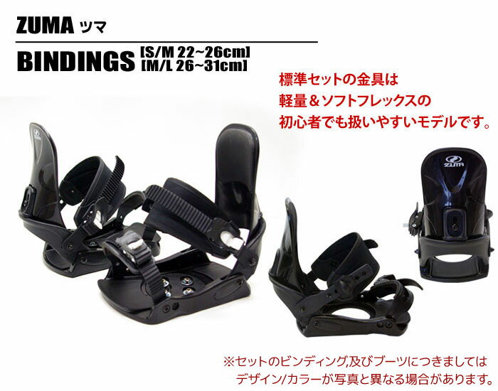 スノーボードブランドのZUMA(ツマ)が販売するスノーボード初心者の男性におすすめ3点セットです。セットの中には荷重をトップとテールに伝えやすいキャンバー構造で、ハードバーンにも対応するボード板が含まれています。