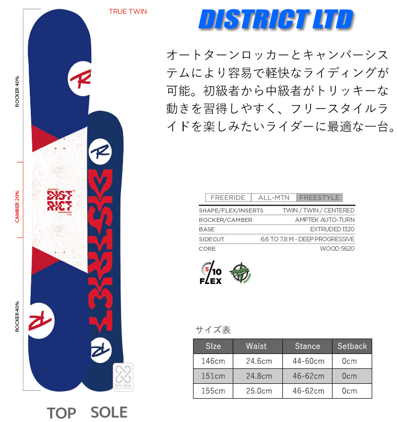 フランスの人気スノーボードメーカー・ロシニョールより販売されているこちらの3点セットには、オートターンロッカーとキャンバーシステムにより軽快で容易なライディングができる高性能でデザインもおしゃれなボード「DISTRICT-LTD」が含まれています。