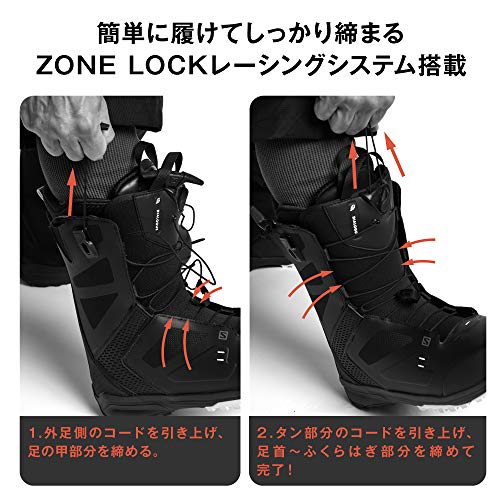 サロモンのこちらのスノーボードブーツは、ご自身で紐を締め上げるよりも簡単なゾーンロックレーシングシステムを採用しました。日本人の足型に合わせたワイド仕様のおすすめスノーボードブーツです。サイズも多いので、さまざまな足の大きさに対応できます。