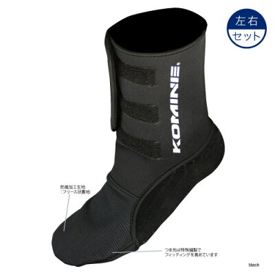 人気バイクウェアブランド・コミネが販売する「ネオプレーンウォームアンクルカバー」は、防風性や保温性に優れウェットスーツにも使用される、ネオプレーン素材で作られた足首用の防寒アイテムです。正面にはコミネの名前が記されています。