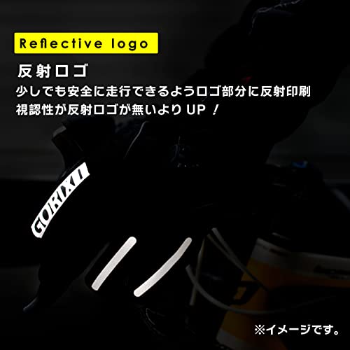 スマホに対応するのは親指・中指・人差し指です。手の甲側には防水・撥水生地を使用しました。長めの仕様で手首までをすっぽりと覆えます。グリップ加工も施されているため、ハンドルを握っている時にも滑りにくいです。反射ロゴ付きで、夜間のロードバイク走行でも安心感があります。