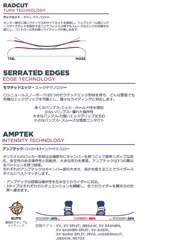 メンズにおすすめなロシニョールのスノーボード板「XV-SUSHI」は、短めのテール形状でカービングもしやすく、小回りもよく効きます。ディープパウダーもツリーランもストレスフリーで楽しめるスノーボード板です。